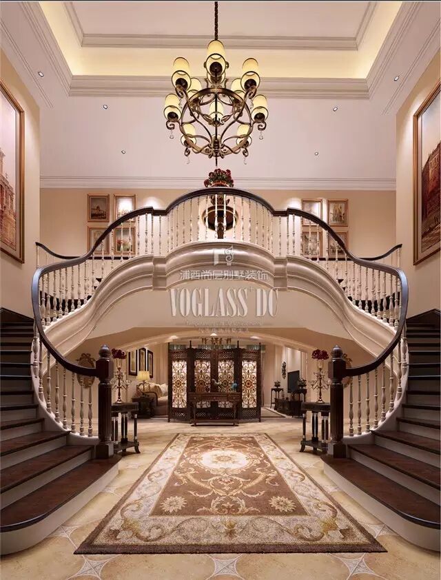 ▲极具特色的楼梯,两边开口呈皇冠状,优美的弧度,中间又立有一个古典的屏风,颇有“一步一景”之美。